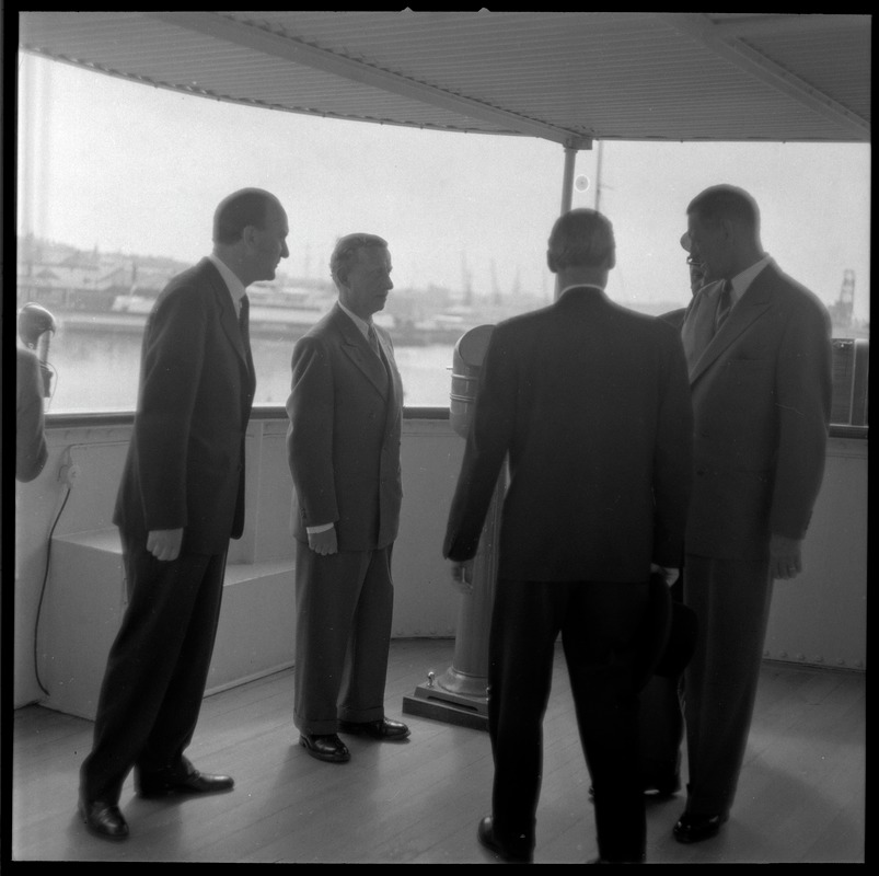 Bilden föreställer fyra stycken män i helfigur vända mot varandra och utomhus under ett tak.