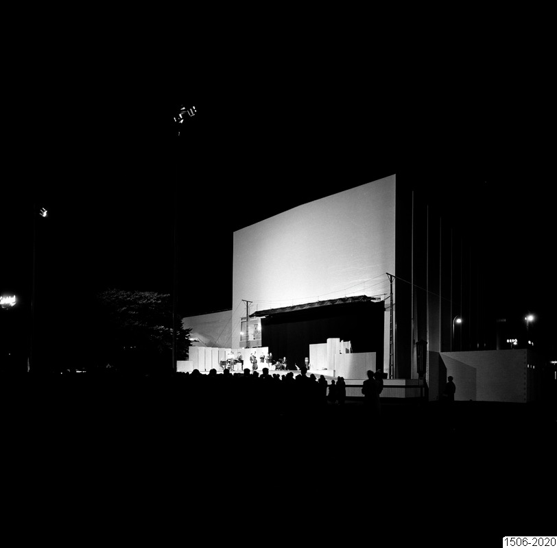 Bilden föreställer en hög byggnad med utescen på avstånd. Framför scenen publik och eventuellt belysning.