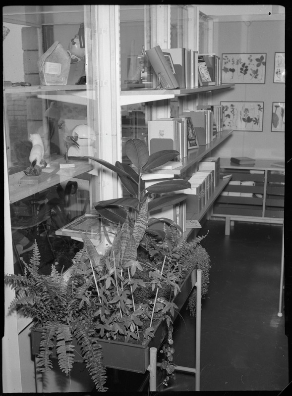 Bilden föreställer ett utsnitt av ett vardagsrum. I förgrunden ett tråg med växter, där bakom en bohylla. På bakre vägen ett skåp samt tavlor med växtmotiv.