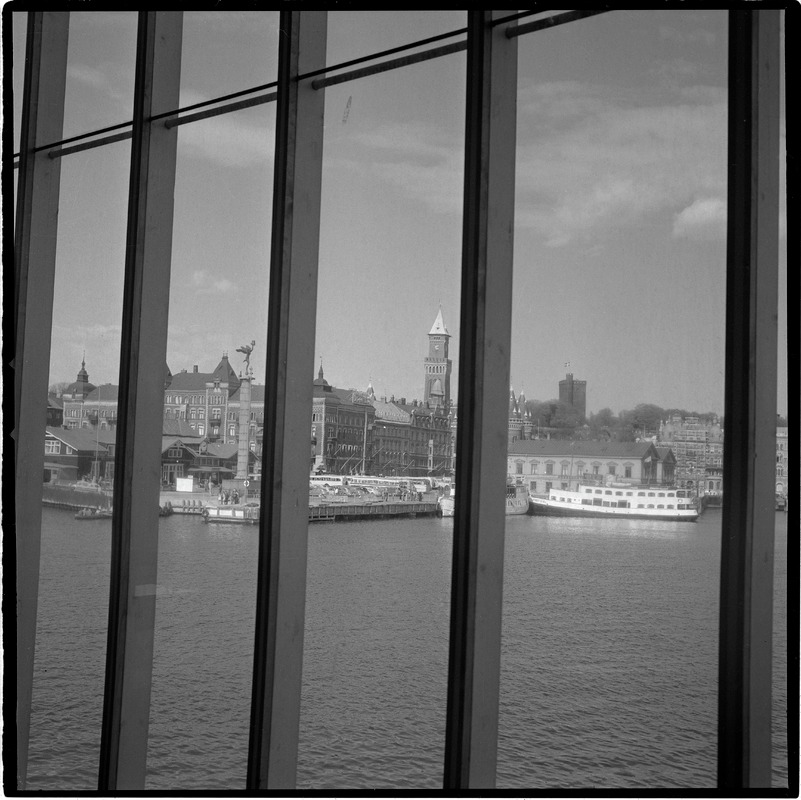 Bilden föreställer en glasfasad. Utanför den hamnen med båt och stadens byggnader.
