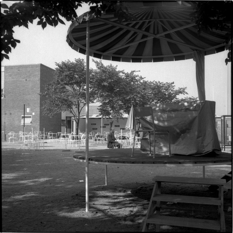 Bilden föreställer en liten utomhus scen med runt tak. I bakgrunden yta med träd och under dem stolar, där bakom byggnad.