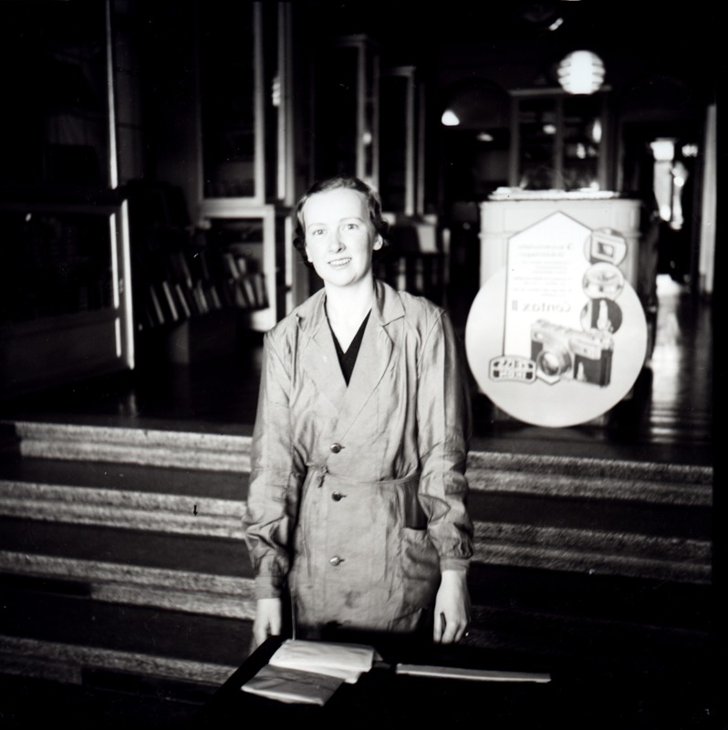 Fotografi som avbildar en kvinna framför en kamerareklamskylt. Troligen associerad med Hefoma.