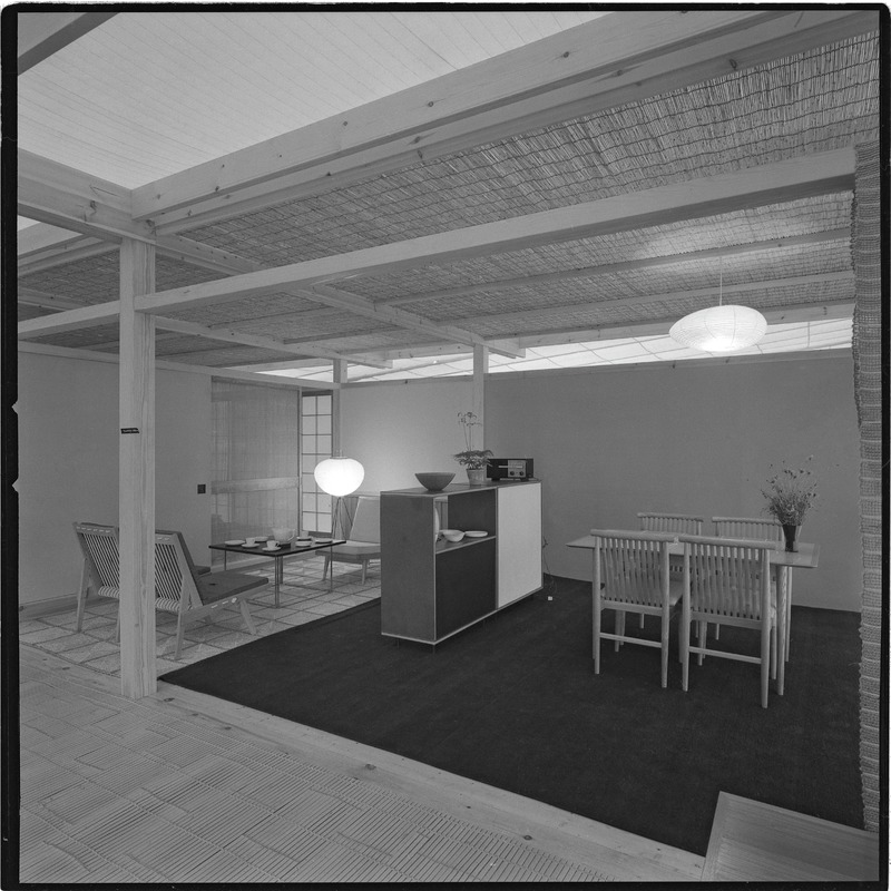 Bilden föreställer två inetriörer med hylla emellan. Till vänster stolar och matbord med blomvas på. På andra sidan hyllan bord med kaffeservis och fåtöljer.