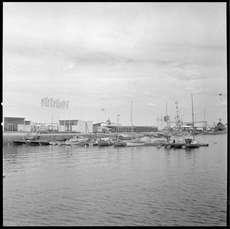 Bilden föreställer hamnen med brygga där båtar ligger förtöjda. I bakgrunden Parapeten med paviljonger och flaggor.