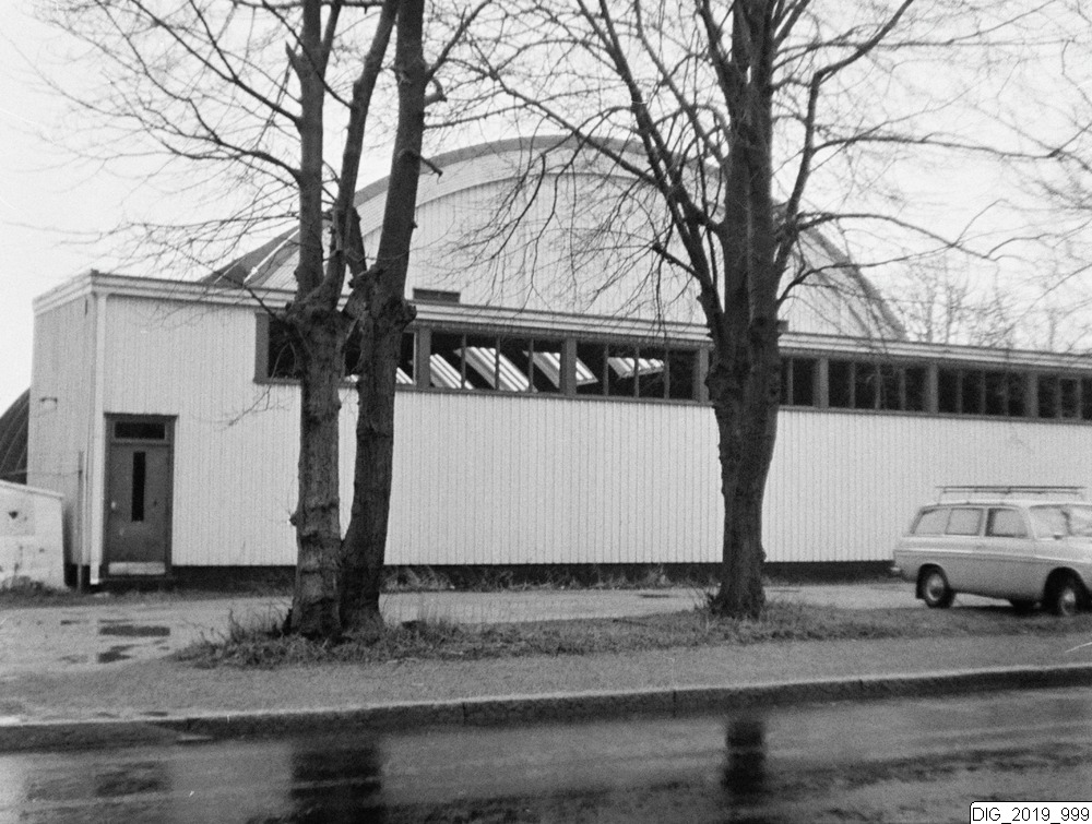 Bilden föreställer gamla ridhuset Ringstorpsvägen. I förgrunden en regnvåt gata. Där bakom trottoar och två träd. I bakgrunden ridhus.