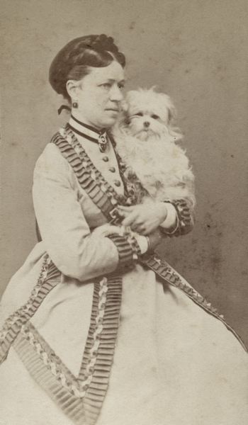 Visitkortsporträtt i svartvitt som avbildar konsulinnan Amalia Flyborg. Hon har en avancerad håruppsättning med fläta lagd över hjässan. Hon bär örhängen och halsband. Hon har en vit hund i famnen.