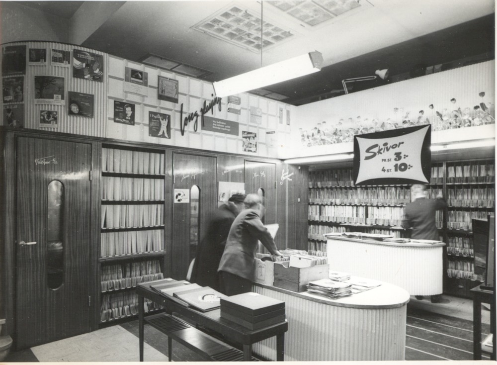 Fotografi som avbildar grammofon avdelningen i Hefomas affär på Järnvägsgatan 3 före ombyggnaden 1957-58. Bilden var daterad "1/4 1955". I bakgrunden ser vi båsen som används för att lyssna på grammofonskivor ostört, dörrarna är bevarade; se 2790 och 2791-2020.