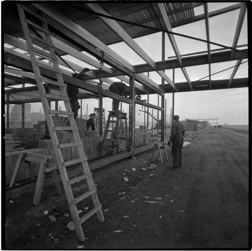 Bilden föreställer en byggnad under uppförande. Där står en stege och två personer.