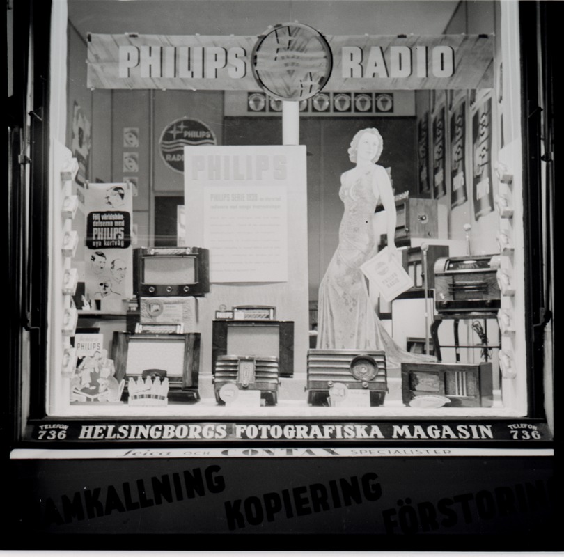 Fotografi som avbildar ett av Hefomas skyltfönster på Järnvägsgatan före ombyggnaden av fasaden.