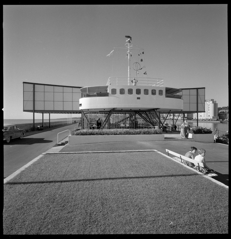 Bilden föreställer i förgrunden troligen yta med gräs. I bakgrunden en paviljong där främre delen utgörs av en modell av en kommanobrygga på ett fartyg.