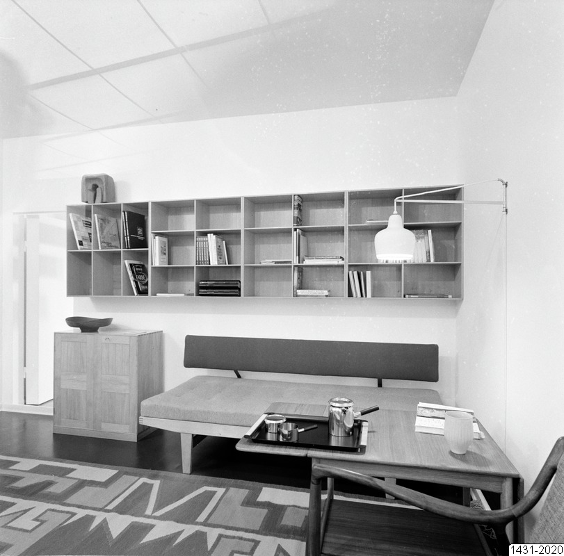 Bilden föreställer en hörna av ett vardagsrum. På bakre väggen en bokhylla, under den en soffa och ett skåp. I förgrunden en stol och ett bord samt en matta och en lampa.