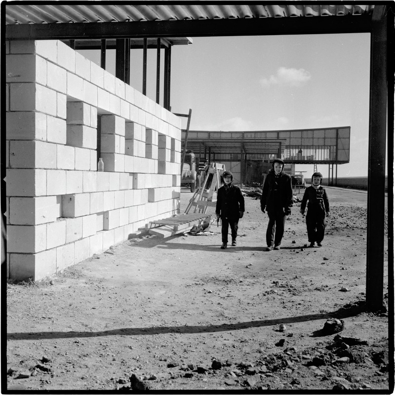 Bilden föreställer tre personer som kommer gående på mark under bearbetning. Till vänster fasad under uppbyggnad och i bakgrunden paviljong.