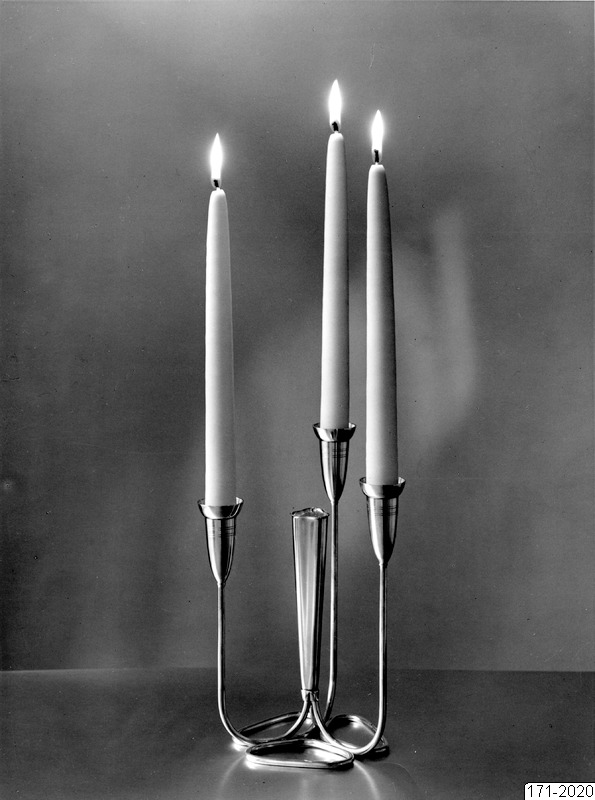 Bilden föreställer W.A. Bolin, hovjuelerare. Ljusstake ferö tre ljus - i mitten en inkompunerad vas frö t.ex. en orchidé, eller en kompakt bukett av små korta blommor. Komp. Lars Hedeman.