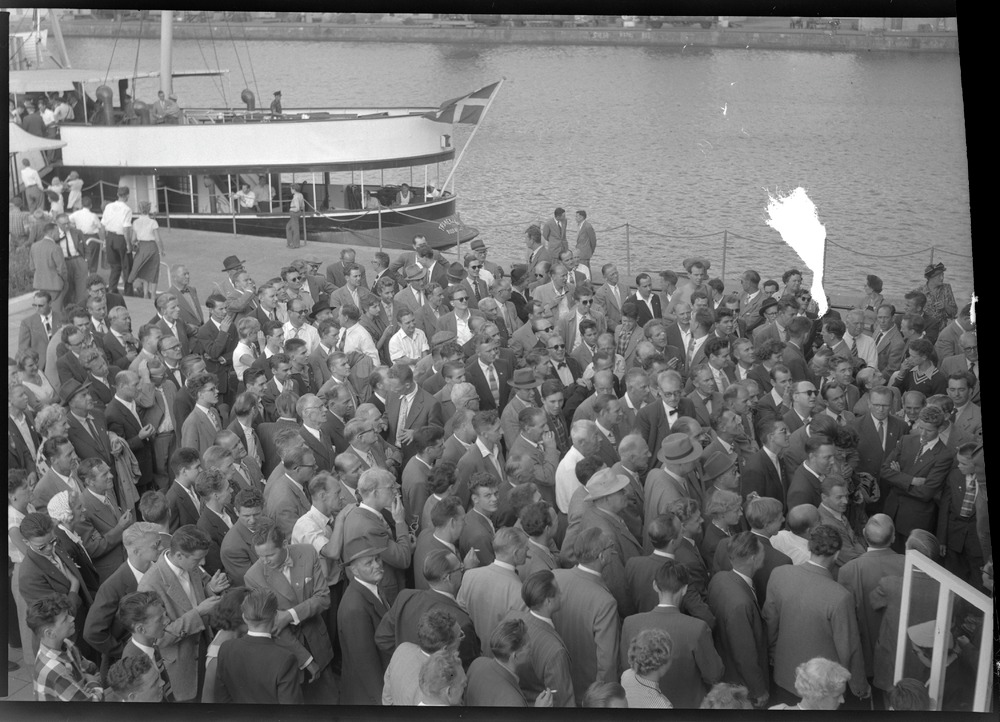 Bilden föreställer en folksamling på en kaj. I bakgrunden kaj och båt.