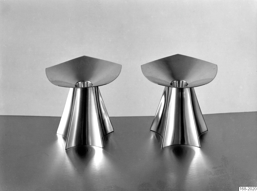 Bilden föreställer W.A. Bolin, hovjuvelerare. Ljusstakar, silver, foten stjärnformad med konkava ytor - lägg märke till reflexerna på underlaget. Komp. J.H Rigolett. Två ljusstakr står på ett bord.