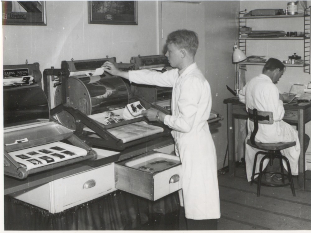 Fotografi som avbildar från vänster till höger; Ove Karlsson och Eric Lindblad arbetandes. Bilden är troligen tagen i Hefomas labb på Järnvägsgatan 3 eller på en av deras filialer, kanske på Södergatan.