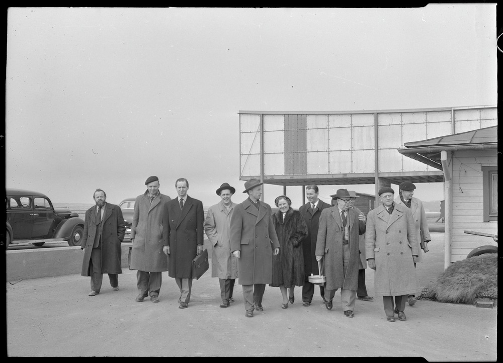 Bilden föreställer 11 personer varav en dam gående utomhus framför en paviljong. Till höger står en bil.