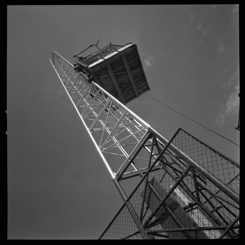 Bilden föreställer en hög stålkonstruktion med troligen hisskorg på. Foto i grodperspektiv.