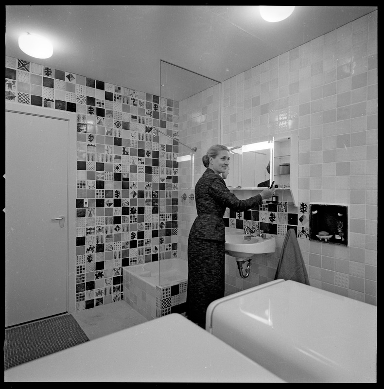 Bilden föreställer ett badrum. I bakgrunden kakladvägg, dörr, duschkabin och handfat med spegel där en kvinna står.