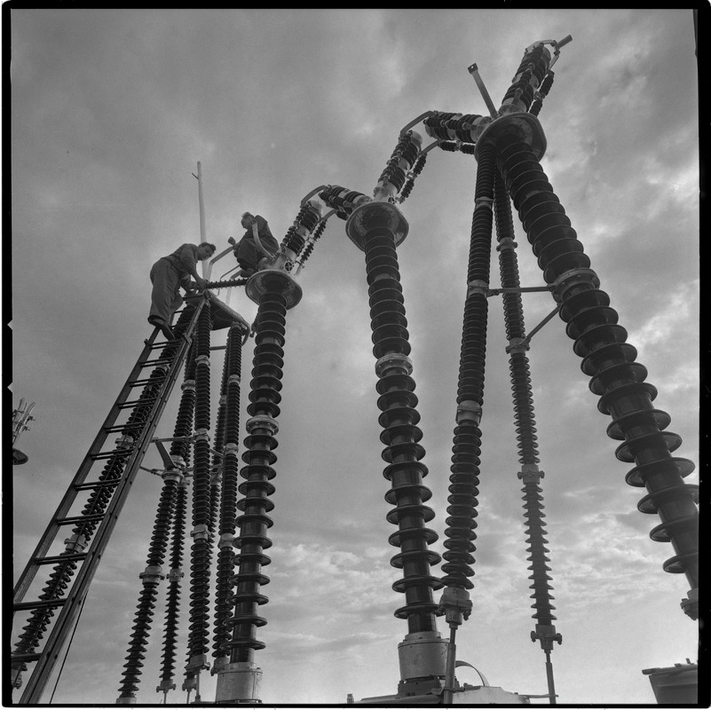 Bilden föreställer tre stycken turbiner på någon form av fundament. Där står en stege lutad och högt där uppe en person