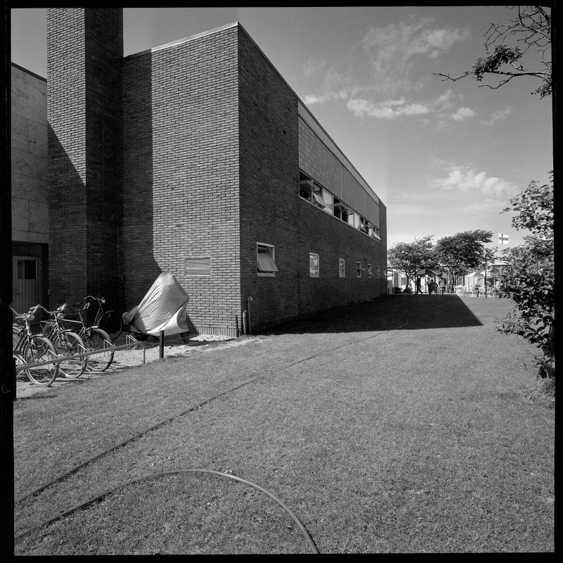 Bilden föreställer en gångbana, till vänsyter cyklar i cykelställ samt byggnader. I bakgrunden träd.
