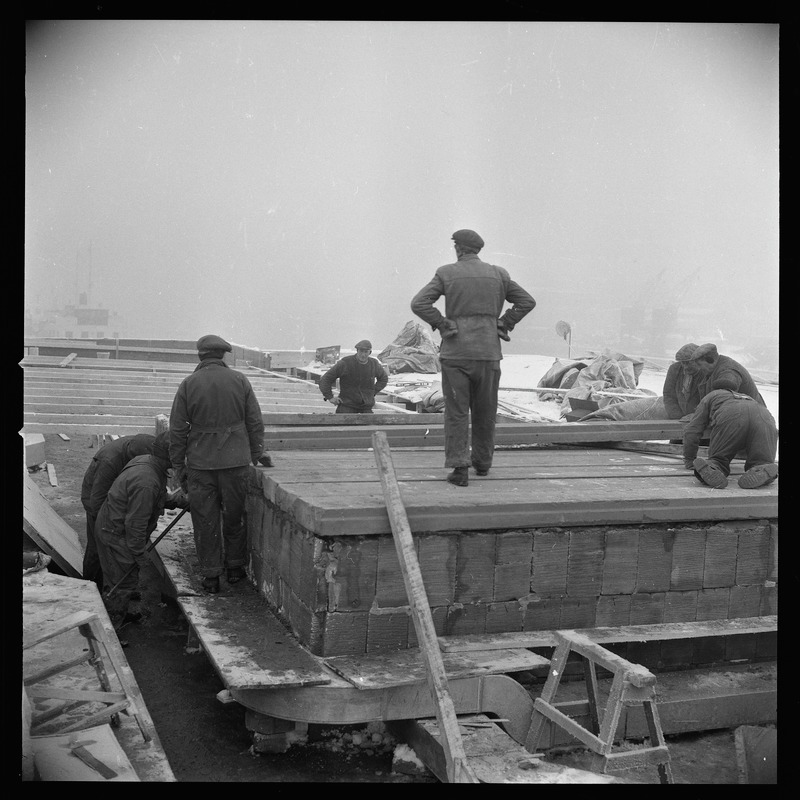Bilden föreställer ett antal byggnadsarbetare som håller på att mura någon form av grund.