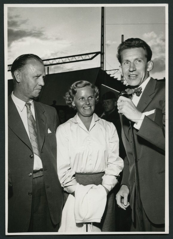 Bilden föreställer KG Sigurd till höger. Där står tre personer fotograferade i trekvartsformat, två män med en kvinna mellan sig. MAnnen till höger håller i en mikrofon. Paviljong i bakgrunden.