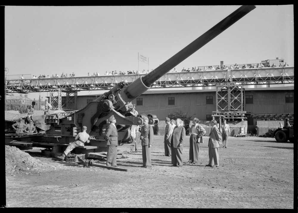 Bilden föreställer en kanon (?) där det står en skara männiksor. I bakgrunden gångbro med människor samt en byggnad.