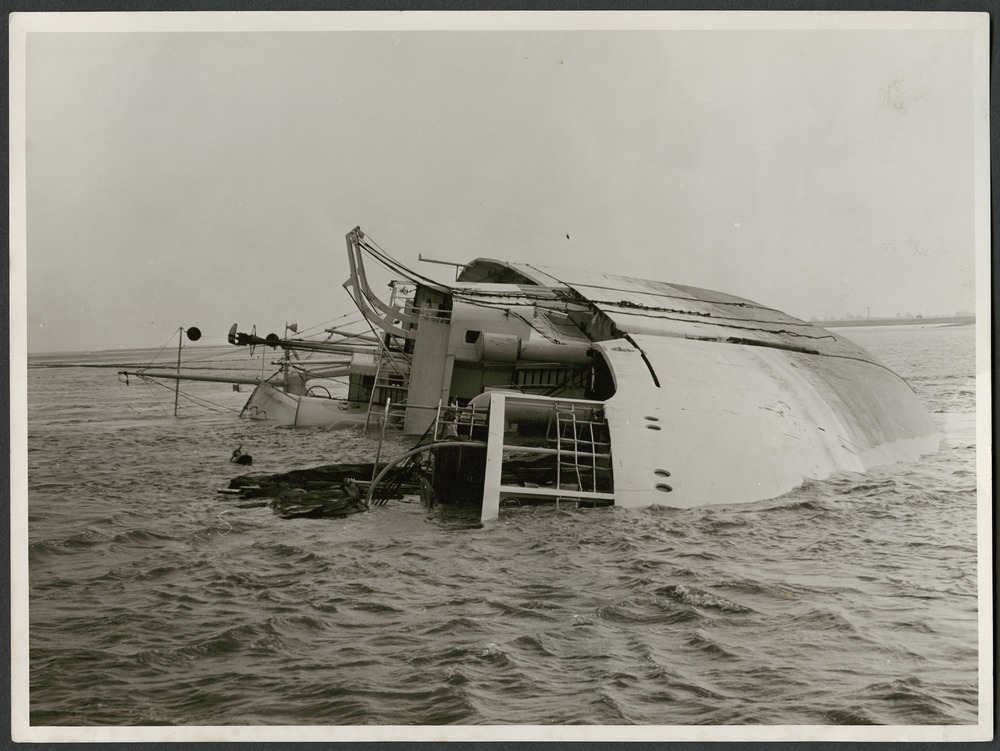 Bilden föreställer ett förlist fartyg, till hälften under vatten. I bakgrunden land.