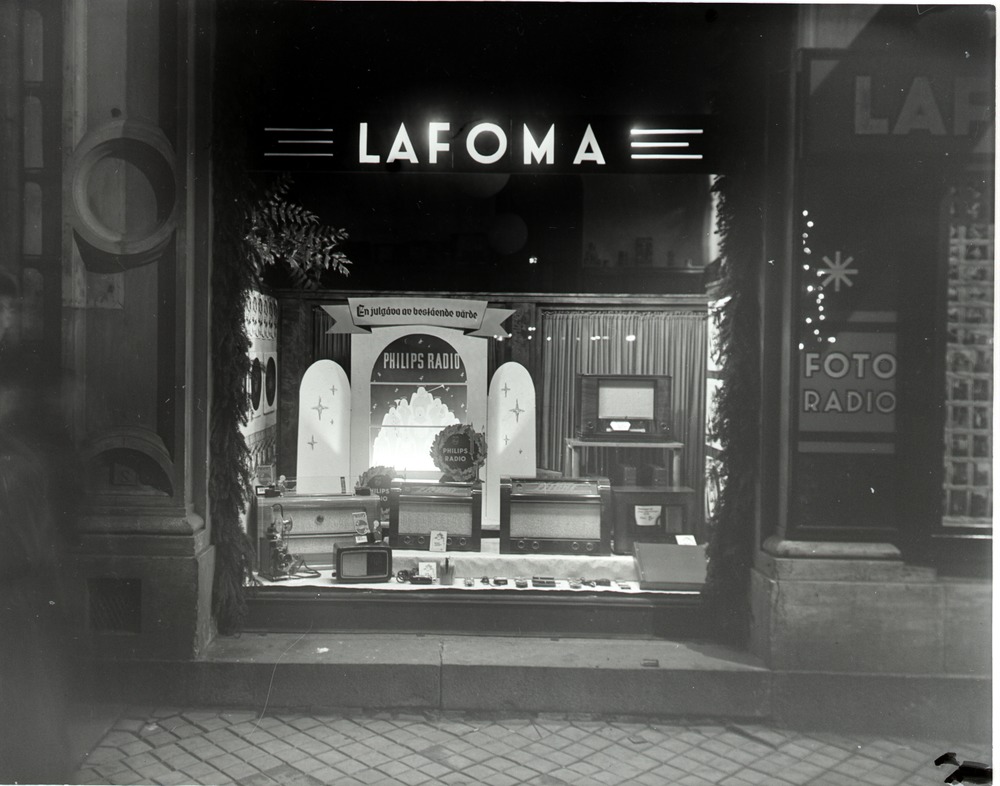 Fotografi som avbildar den juldekorerade utsidan av Lafoma affären på Rådhustorget 1 i Landskrona, en av Hefomas filialer i staden. Bilden är tagen den 20 december 1941.