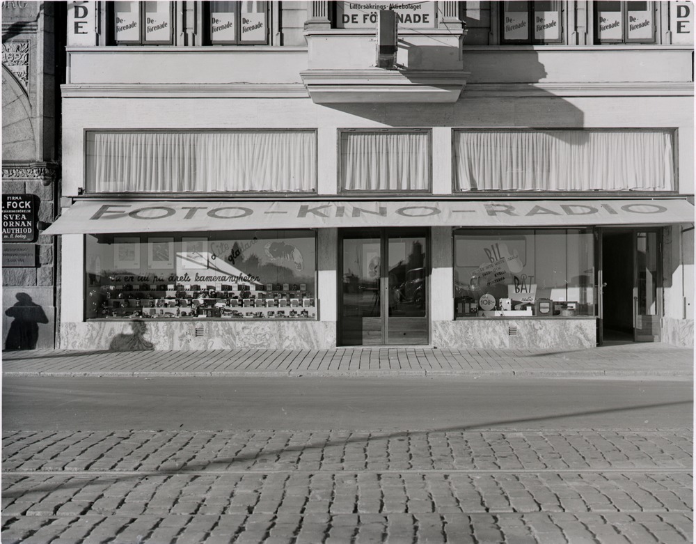 Fotografi som avbildar Hefomas affär på Järnvägsgatan 3. Bilden är tagen efter en av ombyggnaderna av fasaden så bilden är troligen tagen mot mitten av 1900-talet.