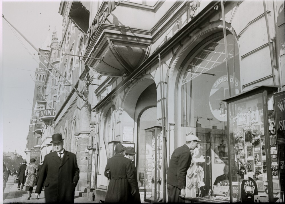Fotografi som avbildar Hefomas affär på Järnvägsgatan 3. Bilden är tagen innan ombyggnaderna av interiören och fasaden så bilden är troligen tagen runt 30- 40-talet. Rådhuset kan skymtas i bakgrunden till vänster.