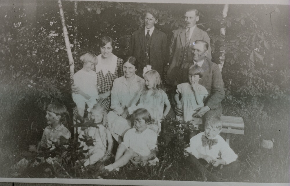 Fotografi som avbildar en familj av tre män, två kvinnor och sju barn. Var och när bilden är tagen är okänt.