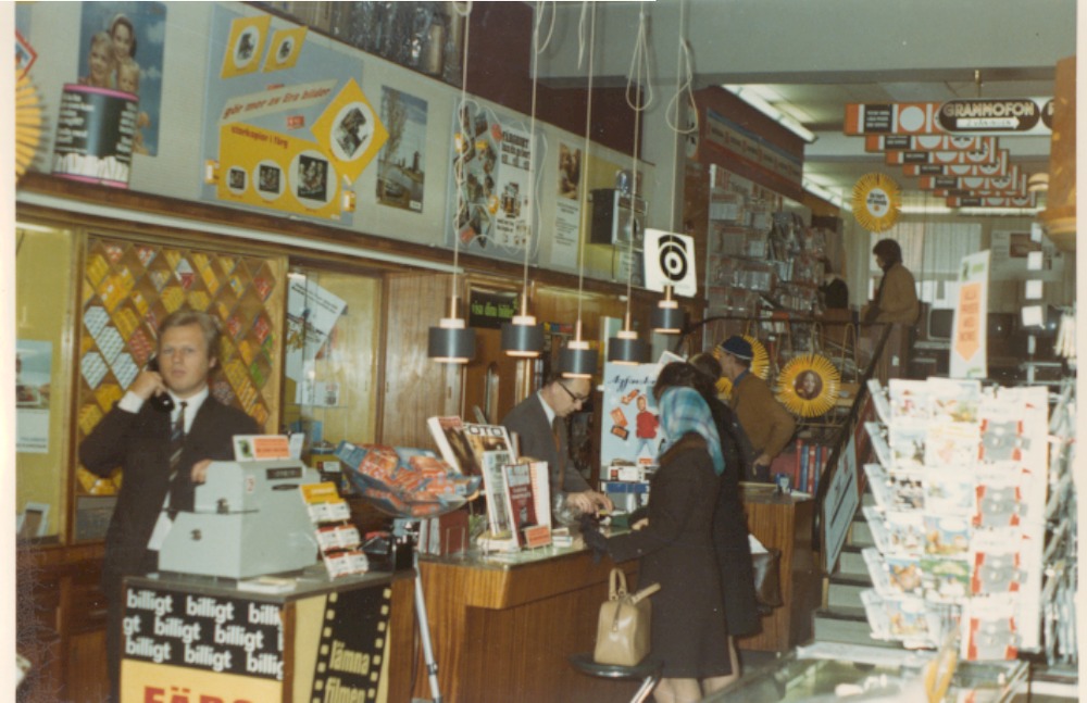 Färgfotografi från 1960-talet som avbildar insidan av Hefomas affär på Järnvägsgatan 3. Fotografiet är taget med entrén bakom fotografen, med foto avdelningen i fokus och med tv avdelningen till höger i bakgrunden.