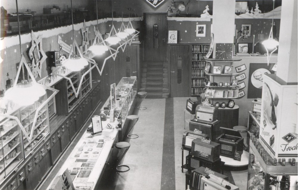 Fotografi som avbildar fotoavdelningen med juldekorationer i Hefomas affär på Järnvägsgatan 3. Uppe till vänster kan vi även se förbindelsegång mellan kontoret och lagret. Dörren till höger på den bakre väggen är till för att lyssna på grammofonskivor, denna tillsammans med en annan är bevarad; se 2790 och 2791-2020. Tagen före ombyggnaden av affären 1957-58.