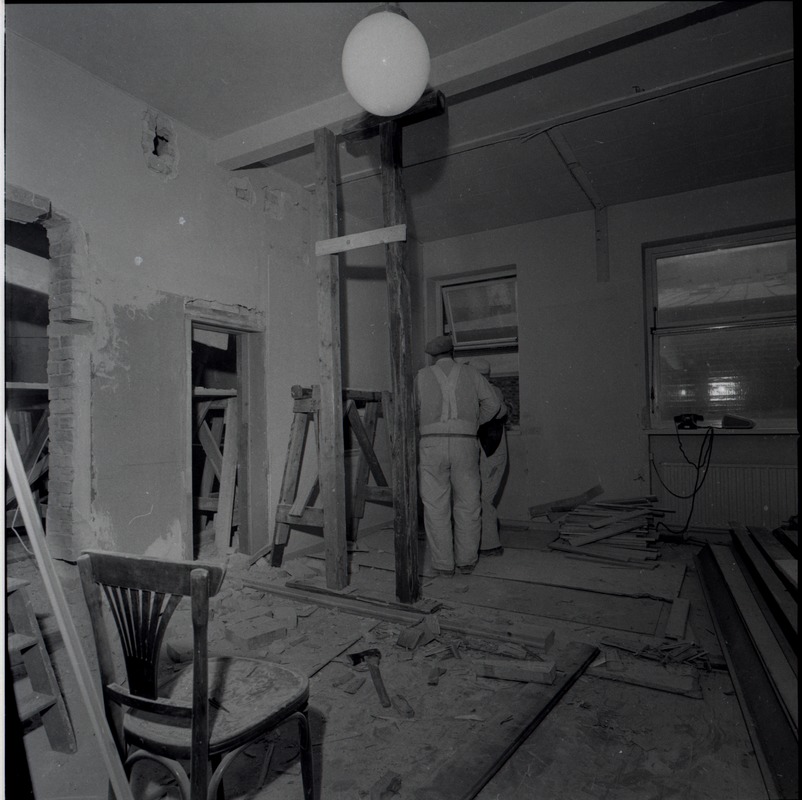 Fotografi som avbildar ombyggnaden av fastigheten som höll Hefomas affär på Järnvägsgatan 3. Här ser vi byggarbetare i arbete.
