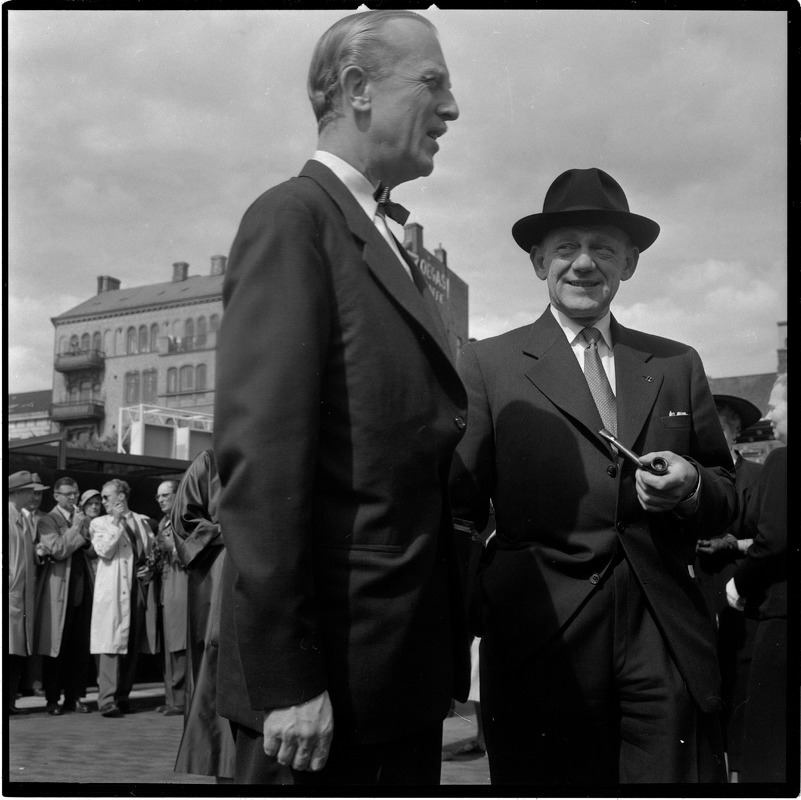 Bilden föreställer två män fotograferade i trekvartsfighur. I bakgrunden människor och byggnader.