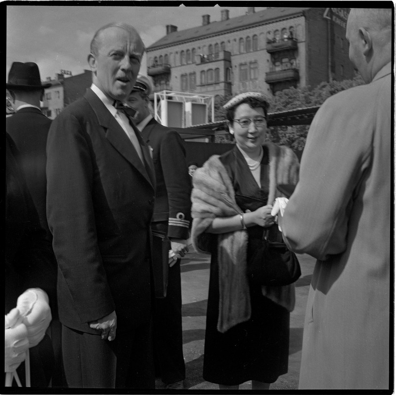 Bilden föreställer en man och en kvinna i trekvartsfigur bland andra människor. I bakgrunden byggnad. Kvinnan bär en pälsschal.