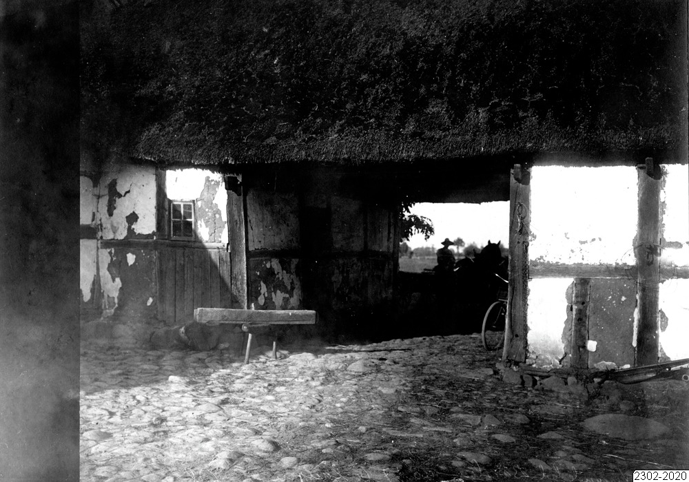 Svartvitt fotografi föreställande gården Bårslöv nr 17, Luggude härad. Fotografi inifrån gården mot länga med port. I porten står en person, en cykel står lutan mot ena väggen.