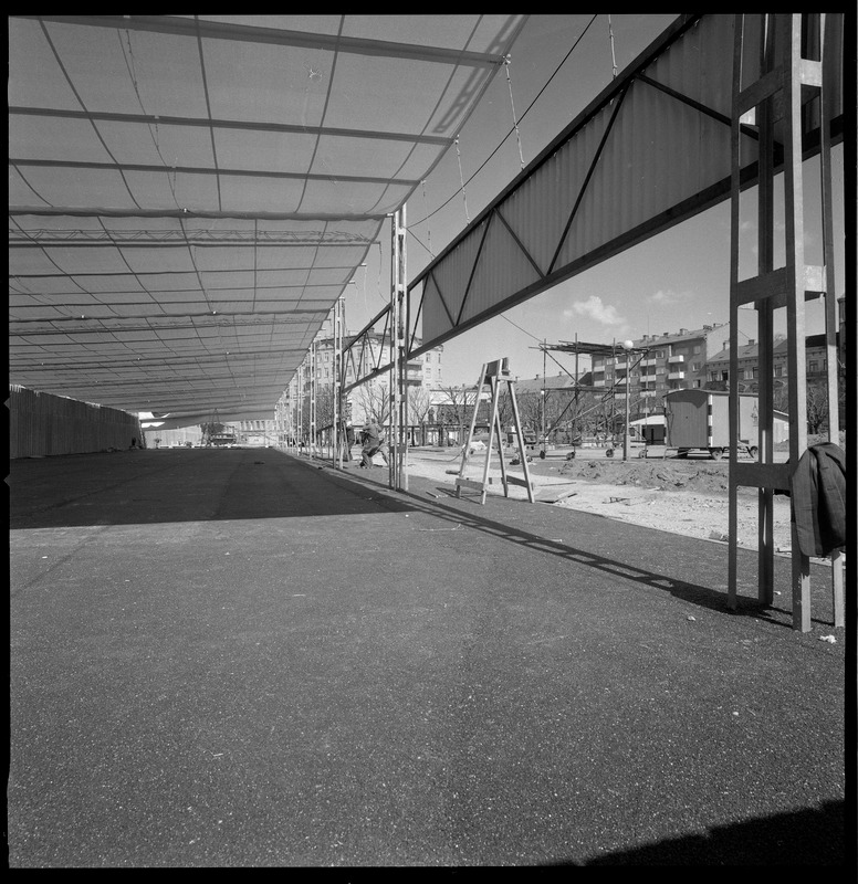 Bilden föreställer en stor öppen hall i en paviljong med öppen fasad på ett håll. Paviljongen är inte inredd. I bakgrunden stadsbebyggelse.