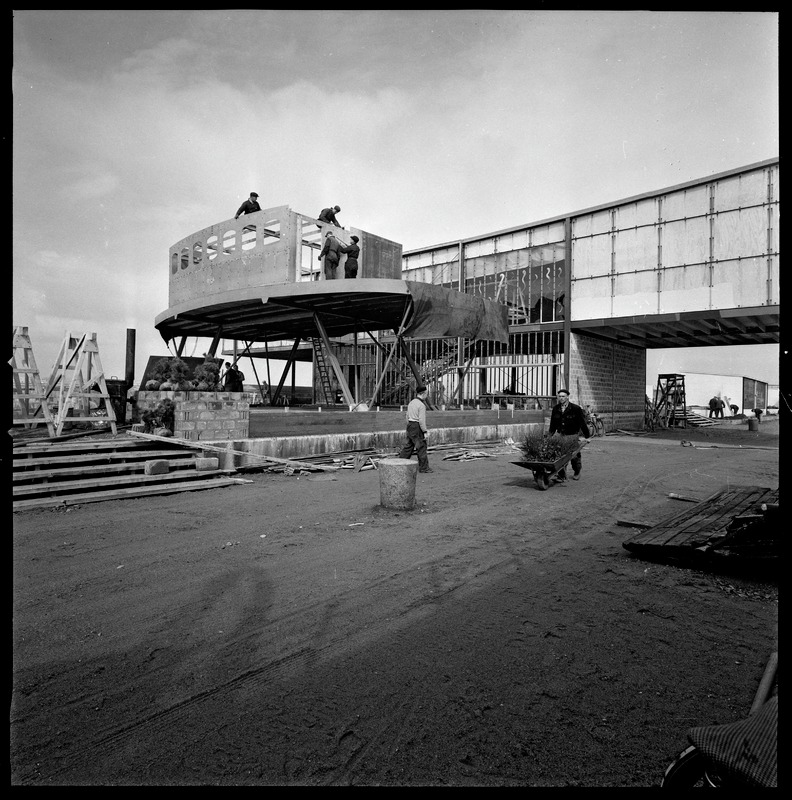 Bilden föreställer paviljong under uppbyggnad. Troligen det som ska bli en båtbrygga. En man kommer körande på en skottkärra, andra arbetare syns också i bakgrunden.