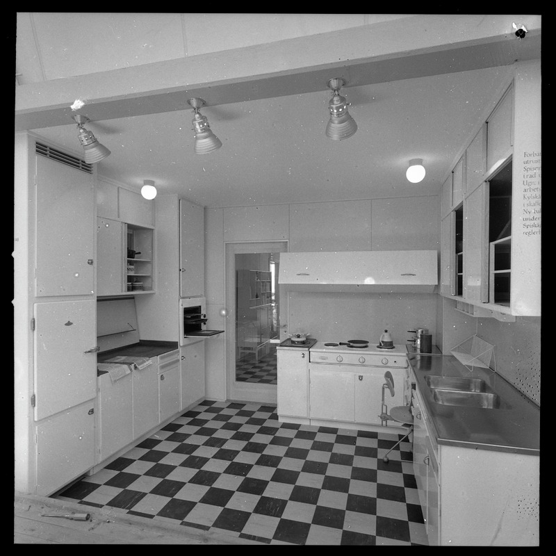 Bilden föreställer ett rum i en paviljong. Troligen ett kök med bänkar, skåp och spis samt ett schackrutigt golv.