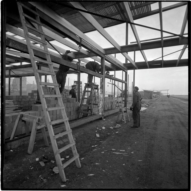 Bilden föreställer en paviljong under uppbyggnad. I förgrunden en stege, där bakom delar av en mur och olika reglar. Där är också några byggnadsarbetare.