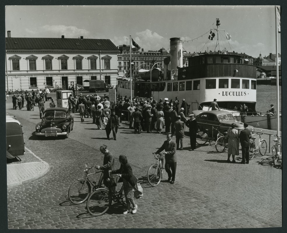 Bilden föreställer vy mot båten Lucullus och gamla tullhuset. Folksamling framför. I förgrunden några personer med cyklar. Bakom finns en öppen yta med en bil på och en folksamling, båtresenärer? Till höger ligger båten Lucullus. I bakgrunden tullhuset och andra byggnader.