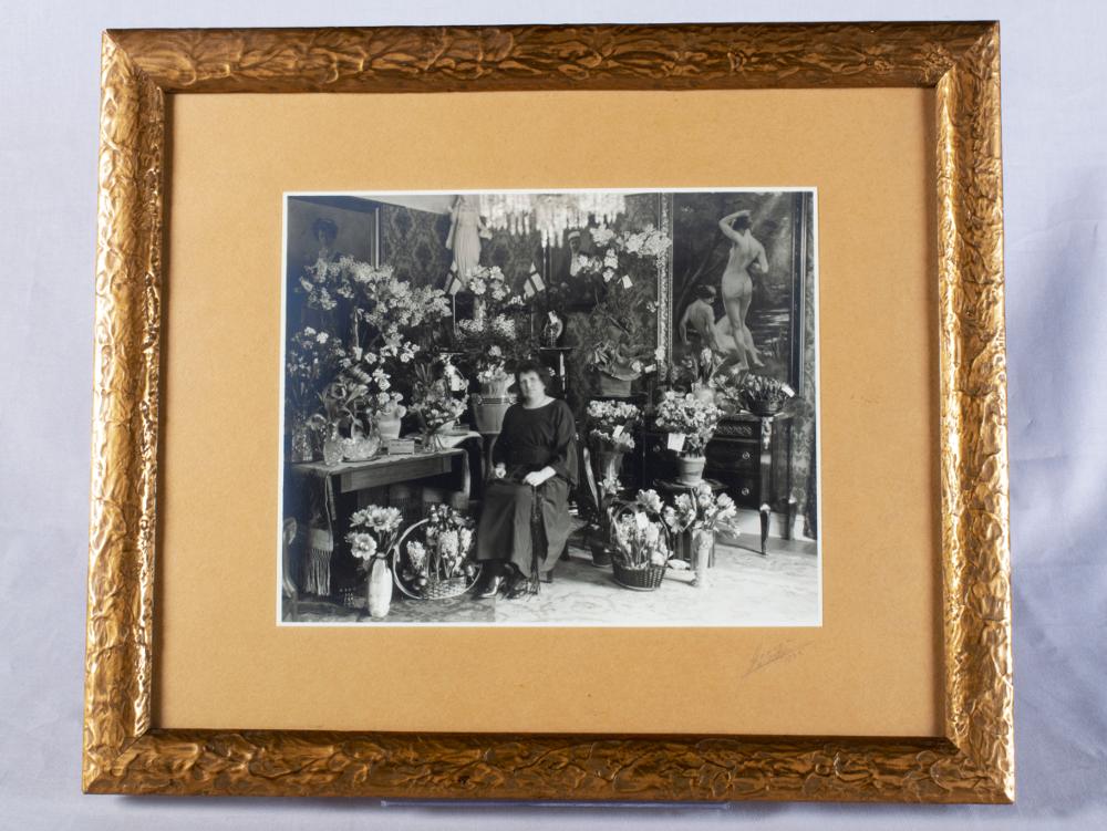 Porträttfotografi föreställande Augusta Klintman iförd klänning, sittande på en stol. Runt henne står blomsterarrangemang och gåvor hon fått i samband med sin 50-årsdag. Under fotografiets nedre, högra hörn finns en handskriven signatur där det troligen står: "George / H-borg / 1922".