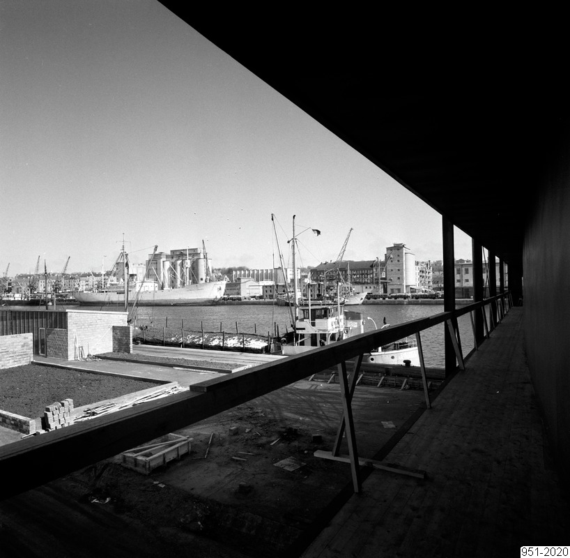 Bilden föreställer i vänsterkanten en saml balkong på en paviljong. Därifrån har man utsikt över en del av utställnigsområdet samt del av Norra hamnen med fartyg.
