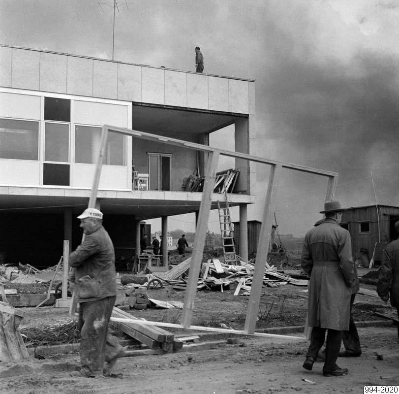 Bilden föreställer resturang Parapeten under uppbyggnad. Det nedreplanet är öppet med stolpar och andra våningen inbyggd. I förgrunden byggnadsmaterial samt två personer som bär på en ram till en vägg.