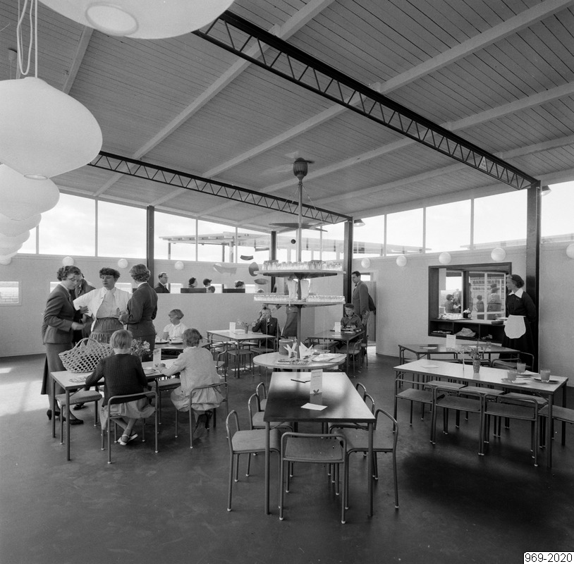 Bilden föreställer en öppen lokal möblerad som en matsal, lampor i taket. I bakgrunden vistas lite människor