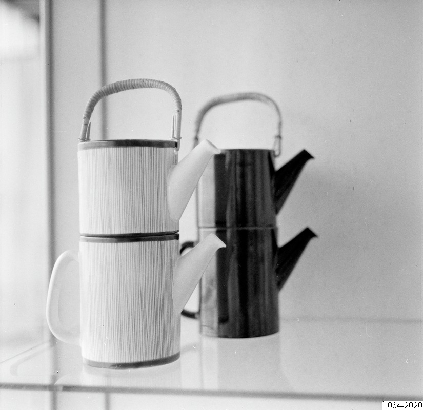 Bilden föreställer fyra kaffekannor, monterade ihop två och två stående på en hylla.