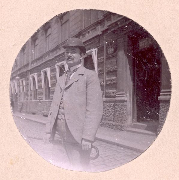 fotografi. litet runt foto porträtt av Notarie Nordborg ? man med en käpp i handen.